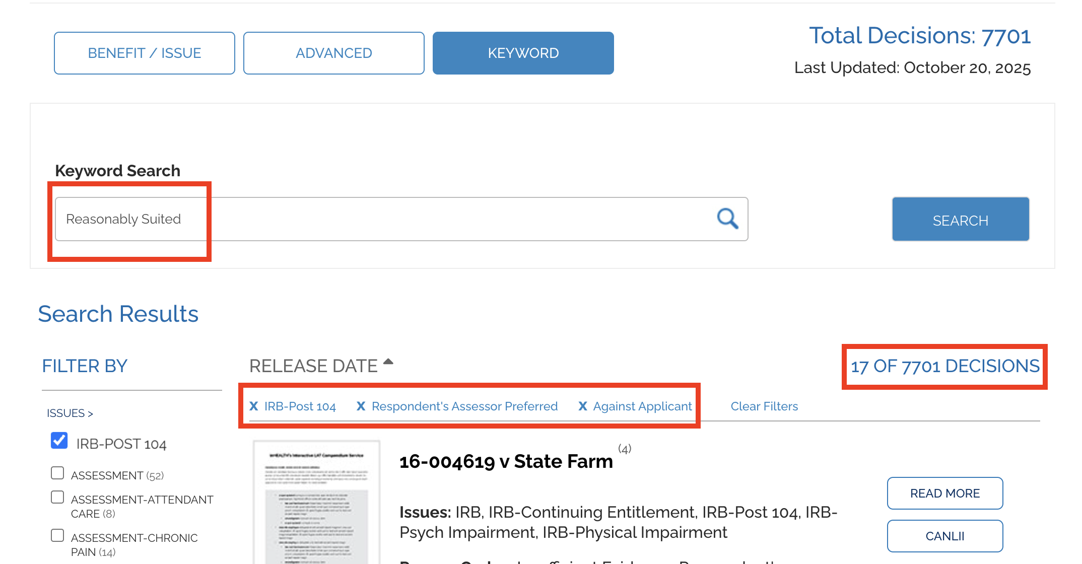 When post 104 IRB’s  are in question, the Tribunal closely examines whether the employment identified by an IE and vocational experts is reasonably suited to the insured person. This determination is not based solely on job availability or generic suitability.