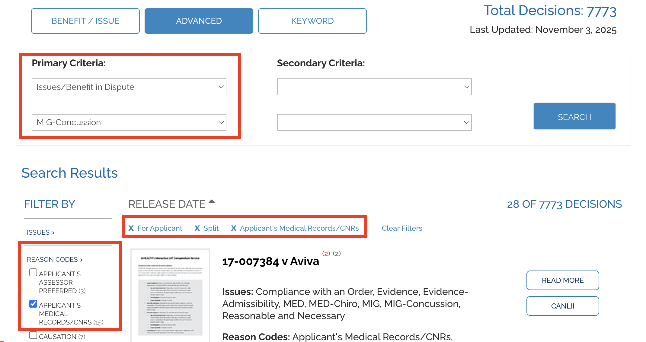 To focus on cases where non-expert medical evidence was front and centre, use the “Applicant’s Medical Records/CNRs” Reason Code. This filter pulls decisions that turned on the treating doctor’s records rather than on expert reports.