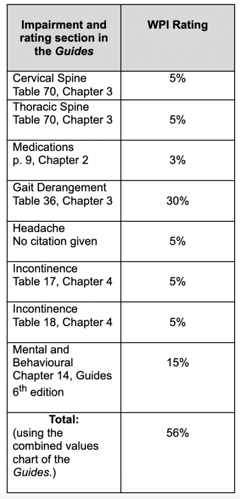 In the Catastrophic Impairment Neurology Evaluation, dated June 9, 2023, Definity’s expert, Dr. Dost, rated Plante as having a 5% WPI rating the under Table 17 of Chapter 4 of the Guides for urinary dysfunction and another 5% WPI rating for anorectal dysfunction the under Table 18 of Chapter 4. Plante contended that “Dr. Dost’s ratings for incontinence should be accepted at face value because he is the only expert to provide a WPI rating for this impairment. In the alternative, the applicant argues that incontinence should be rated according to Dr. Dost’s testimony where he opined that a post-accident exacerbation of both types incontinence would result in a combined 4% WPI rating.”
